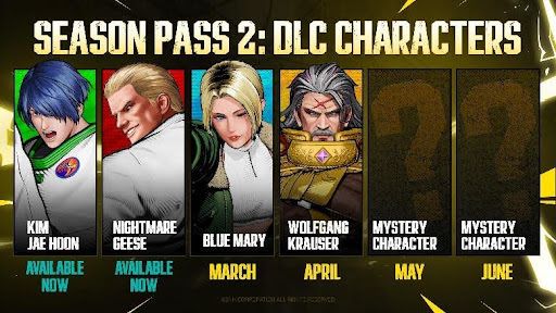 El Pase de Temporada 2 incluye a seis personajes, con un personaje programado para lanzarse cada mes. La Temporada 2 incluye a Kim Jae Hoon (ya disponible), Nightmare Geese (ya disponible), Blue Mary y Wolfgang Krauser de las series de Fatal Fury, además de dos peleadores misteriosos que serán anunciados más adelante. FATAL FURY: City of the Wolves Legend Edition incluye el juego base con el Pase de Temporada 1 y el Pase de Temporada 2 (ya disponible), y garantiza acceso a los peleadores ya existentes, además de los nuevos que llegarán con la Temporada 2.