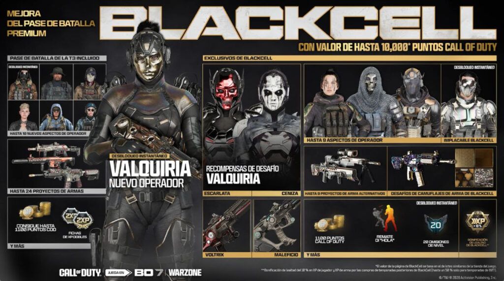 - Bonificación de lealtad: quienes compraron BlackCell en Temporada 2 y ahora en la Temporada 3 activan un 10% permanente de XP de jugador y de arma (acumulable hasta 50%).