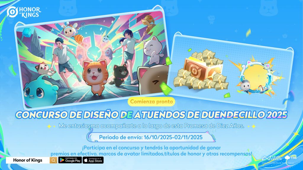 Además, a partir del 16 de octubre, el Concurso de Diseño de Trajes de Duendecillos 2025 invita a los jugadores a mostrar su creatividad y diseñar un look único para el Duendecillo Felino bajo la temática “Viaje”, inspirado en aventuras interestelares, travesías oceánicas u otros viajes imaginarios. Los participantes pueden enviar sus diseños hasta el 2 de noviembre para tener la oportunidad de ganar premios en efectivo de hasta $1500 USD, recompensas exclusivas en el juego y títulos especiales de creador, como Creador Superestrella, Creador Maestro y Creador Novato. Las propuestas preseleccionadas se someterán a la votación de la comunidad y a la revisión de expertos a lo largo de noviembre y los ganadores finales se anunciarán el 5 de diciembre. Ahora que Honor of Kings entra en su próxima década, la creatividad de los jugadores seguirá dando forma al juego. ¡Únete ahora y deja que tu creatividad despegue!