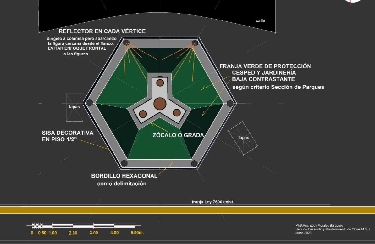 La obra fue hecha por el escultor costarricense Juan Carlos Abarca, mide más de 7 m., consta de 3 estatuas cada una con un significado particular, tendrá una hermosa base que narrará la historia de la escultura y su trasfondo, así como detalles alusivos a ambos países, contará con reflectores para iluminarla en la noche y con múltiples detalles para resaltarla y mostrar cada aspecto de su composición.