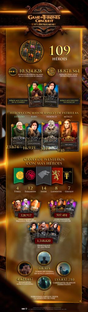 En el octavo aniversario del título, los jugadores han desbloqueado colectivamente héroes casi 19 millones de veces, desde personajes favoritos de los fans como «Rhaenyra Targaryen, The Black Queen» hasta aliados inesperados como «The Night King, First White Walker». Los jugadores también han intentado apoderarse del Iron Throne y han marchado sobre King’s Landing más de 4.4 millones de veces.