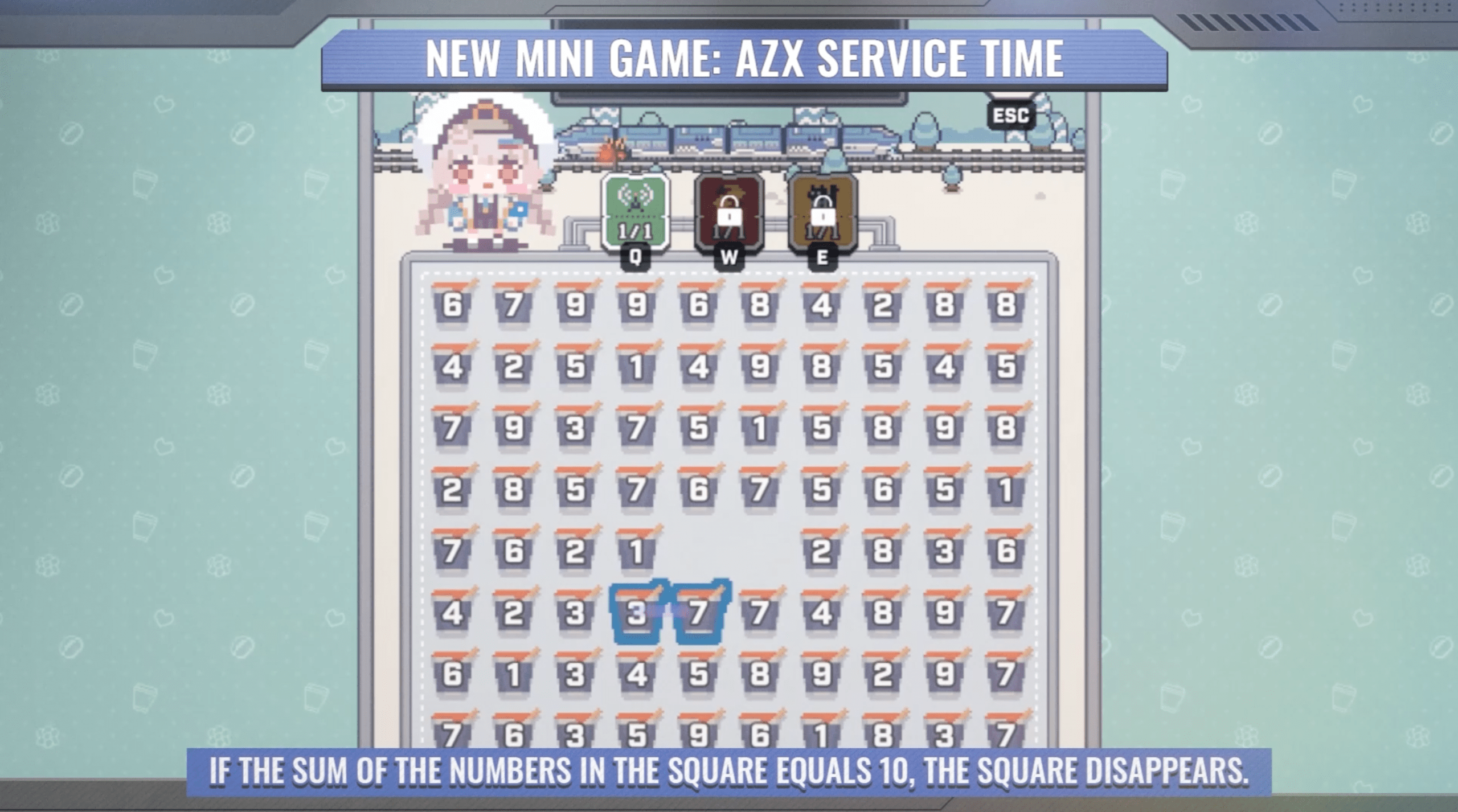 - Minijuego: AZX Service Time: Un rompecabezas relajante en el que los jugadores deben unir números que sumen 10 para eliminarlos y avanzar.