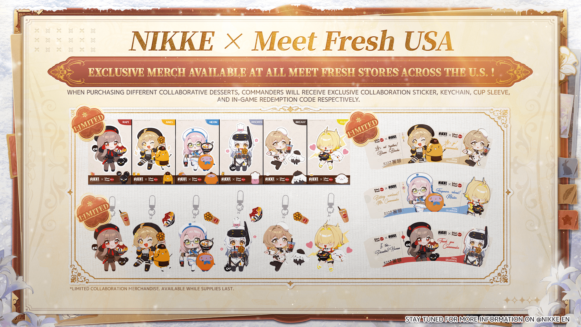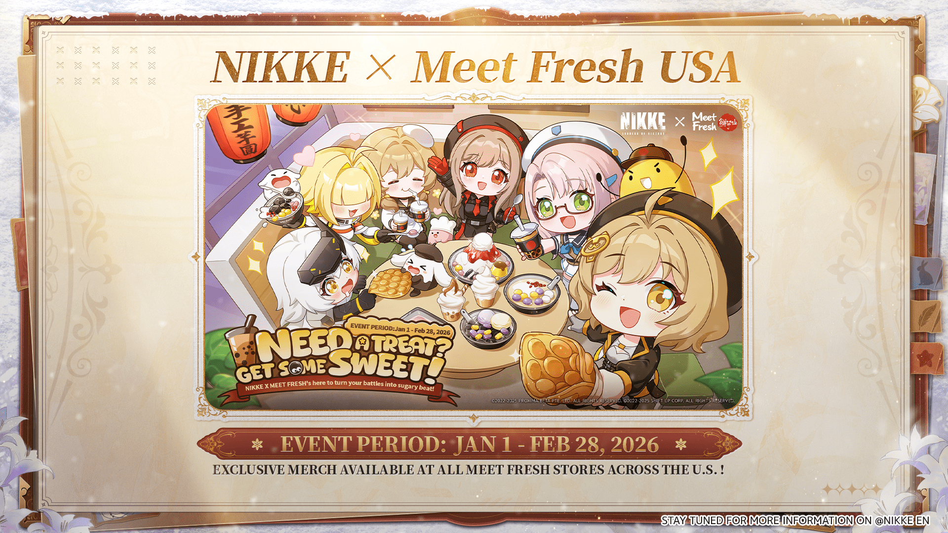 Para iniciar 2026, Goddess of Victory: Nikke se une a la popular cadena taiwanesa de postres Meet Fresh en una colaboración comercial exclusiva en todo Estados Unidos, que se llevará a cabo del 1 de enero al 28 de febrero de 2026. Durante el periodo del evento, los jugadores que compren el set especial de postres de la colaboración recibirán un paquete de artículos físicos exclusivos, que incluye una calcomanía, un llavero, una funda para vaso y un valioso código de canje dentro del juego.