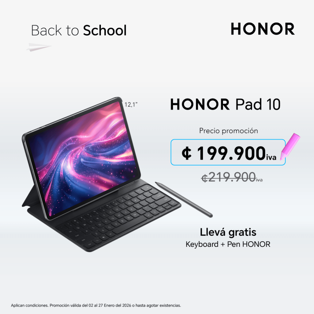 Para este inicio de curso lectivo, HONOR ha preparado promociones especiales de regreso a clases, con descuentos, precios preferenciales y exclusivos en tablets, laptops y smartphones seleccionados. Las HONOR Pad se han consolidado como aliadas clave en el entorno educativo gracias a su combinación de rendimiento, portabilidad y autonomía. HONOR Pad 10, ideal para estudiantes que buscan alto desempeño, incorpora una pantalla 2.5K de alta resolución que permite una lectura más cómoda de textos y contenidos educativos, reduciendo la fatiga visual durante largas jornadas de estudio. Su batería de 10,100 mAh garantiza horas continuas de uso para clases virtuales, investigación y consumo de material educativo sin interrupciones. Esta pad tienen un valor de ₡199,900.