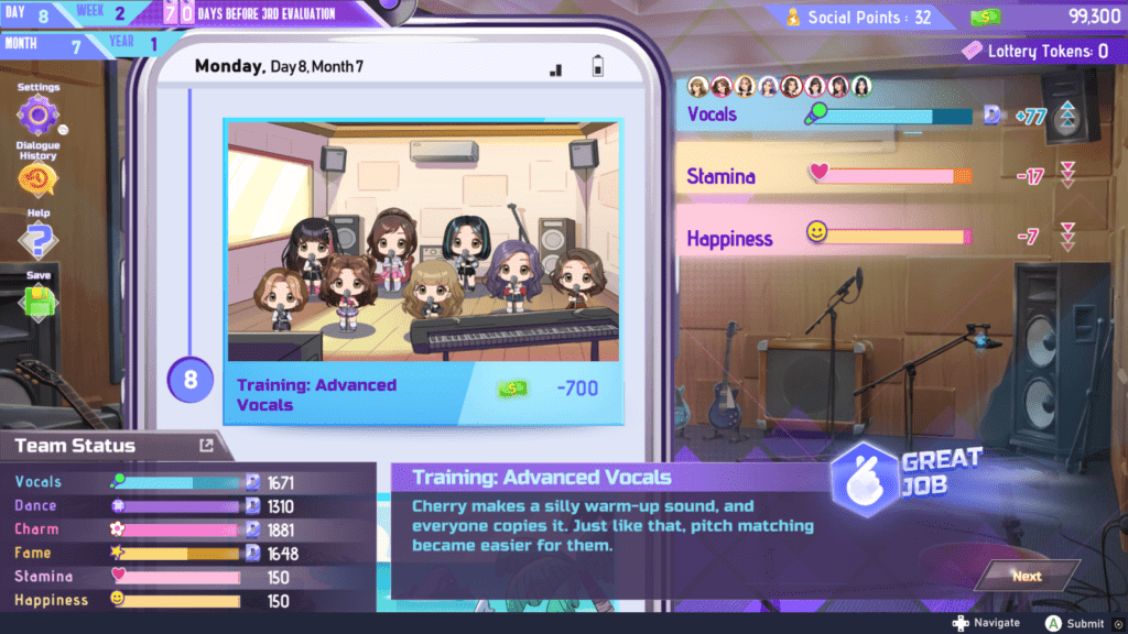 Como mánager, deberás equilibrar resistencia, finanzas y carga de trabajo. Exige demasiado a tus idols y podrían agotarse, pero si los consientes en exceso, te quedarás sin fondos rápidamente.