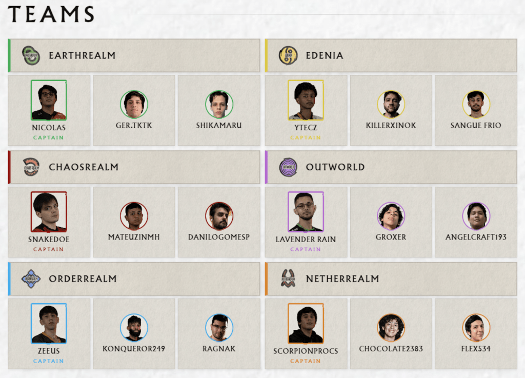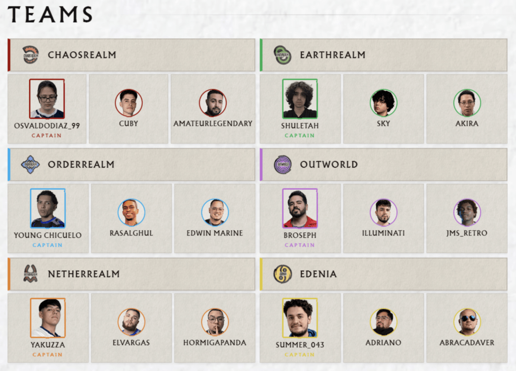 El torneo contará con jugadores de México, Brasil, Argentina, Chile, Honduras, Guatemala, Paraguay, República Dominicana, Puerto Rico y Costa Rica, quienes se dividirán en dos bloques por región: Latam Sur y Latam Norte, cada uno con 6 equipos. Así, 12 equipos en total representarán distintos reinos del universo de Mortal Kombat.