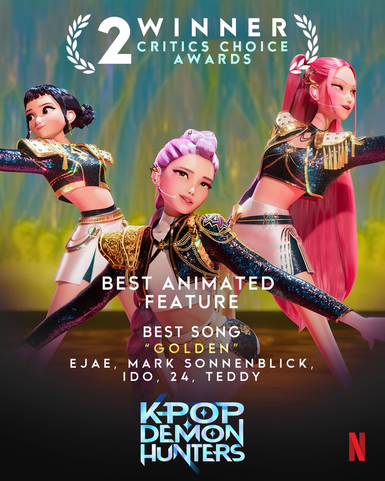 KPop Demon Hunters fue una de las grandes protagonistas de la 31.ª edición de los Critics Choice Awards al ganar los premios a Mejor Película Animada y Mejor Canción. La cinta superó a títulos como Zootopia 2, Elio y In Your Dreams en la categoría animada, consolidando su impacto tanto en crítica como en audiencia. Por su parte, la canción “Golden” se impuso frente a composiciones de artistas como Ed Sheeran, John Mayer y Stephen Schwartz, destacando el peso de su banda sonora dentro del panorama musical del cine.