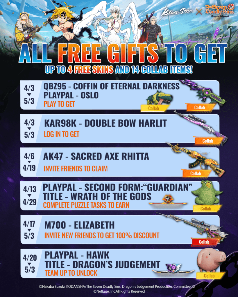Este evento por tiempo limitado presenta contenido icónico inspirado en Meliodas, Elizabeth y más, combinando el poder fantástico de The Seven Deadly Sins con el combate de alta intensidad y la jugabilidad del battle royale de ritmo rápido de Blood Strike.
