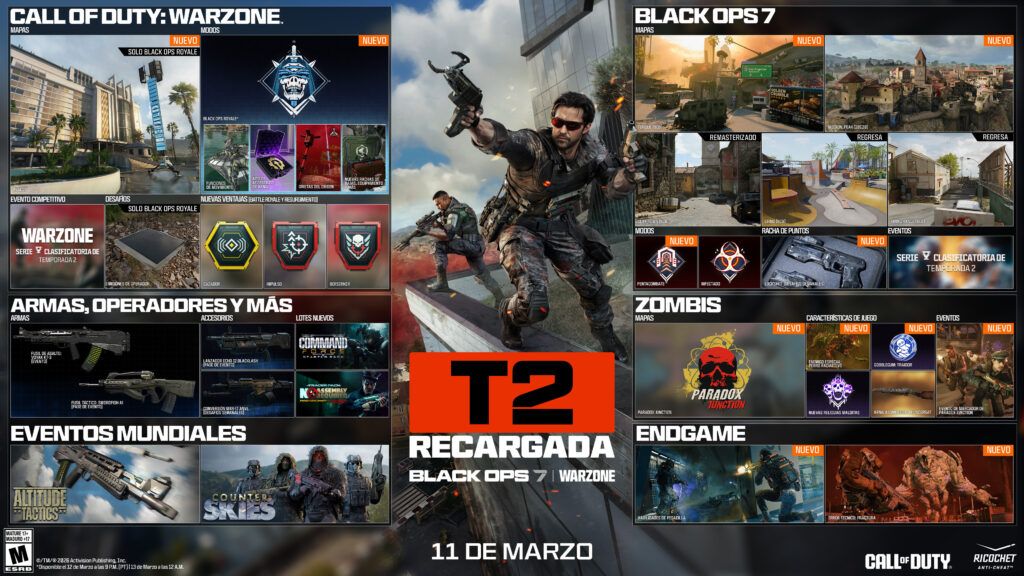 | La Temporada 2 Recargada estará disponible a partir del miércoles 11 de marzo a las 9:00 a.m. (PT) en todas las plataformas. Adquiere Call of Duty: Black Ops 7 hoy mismo para acceder a todo el contenido de la Temporada 2 Recargada, incluyendo Endgame, Multijugador, Zombies y el modo gratuito Call of Duty: Warzone. |