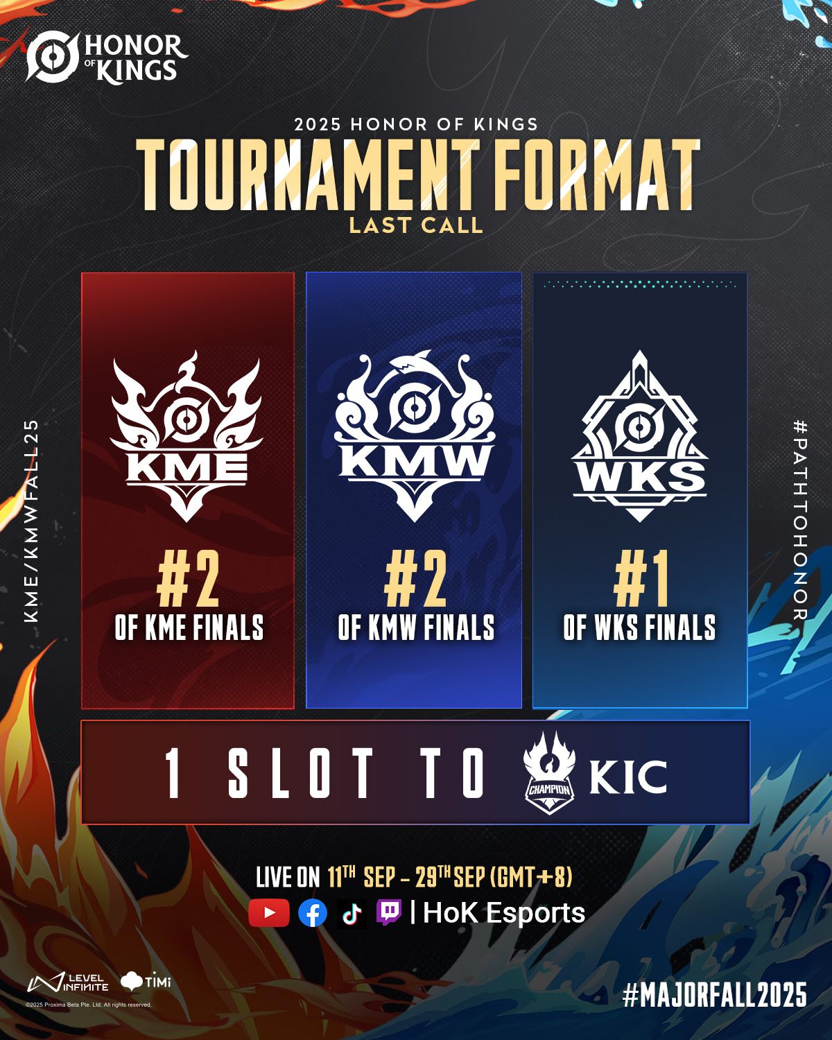 La Honor of Kings Major East League se disputará del 11 al 27 de septiembre, mientras que la Major West League tendrá lugar del 12 al 28 de septiembre en Kuala Lumpur. Los aficionados de todo el mundo podrán seguir toda la acción a través de la retransmisión en directo de ambas ligas. Los campeones de la KME y la KMW se asegurarán su plaza en la KIC, lo que convierte cada partido en una oportunidad crucial para que los equipos demuestren su valía.