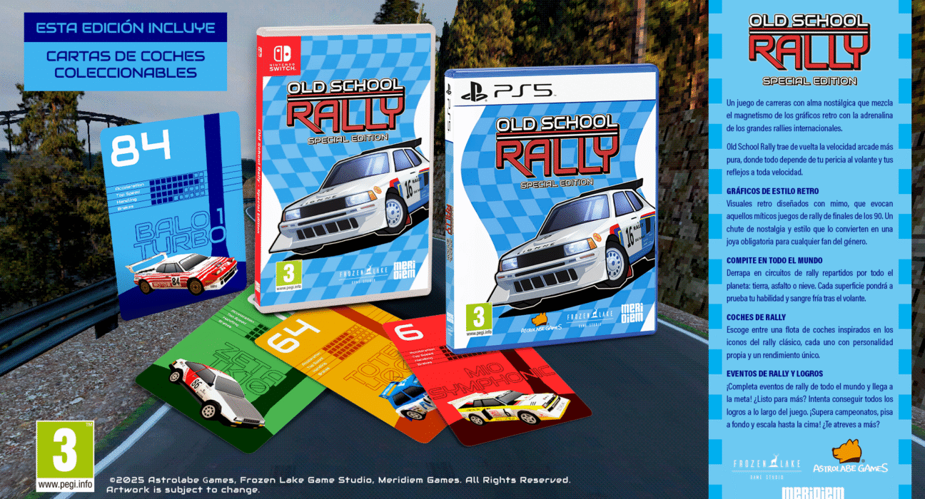 Meridiem se complace en anunciar que publicará la edición física de Old School Rally, un título que ofrece una jugabilidad de ritmo acelerado y estilo arcade, con énfasis en la habilidad al volante y las maniobras a gran velocidad. Desarrollado por Frozen Lake Games y publicado mundialmente por Astrolabe Games, Old School Rally – Special Edition llegará en formato físico para PlayStation 5 y Nintendo Switch el 4 de diciembre de 2025.