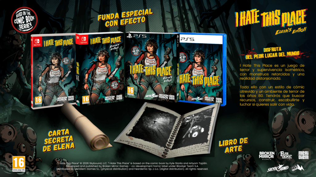 Meridiem se complace en anunciar que I Hate This Place Elena’s Edition llegará en formato físico para PlayStation 5 y Nintendo Switch el 29 de mayo de 2026. Desarrollado por Rock Square Thunder y publicado digitalmente por Feardemic, en colaboración con Skybound Entertainment, I Hate This Place es un juego de terror y supervivencia isométrico, repleto de monstruos retorcidos y realidades distorsionadas, todo ello envuelto en un atrevido estilo artístico de cómic y rebosante de un ambiente de terror de los años 80.