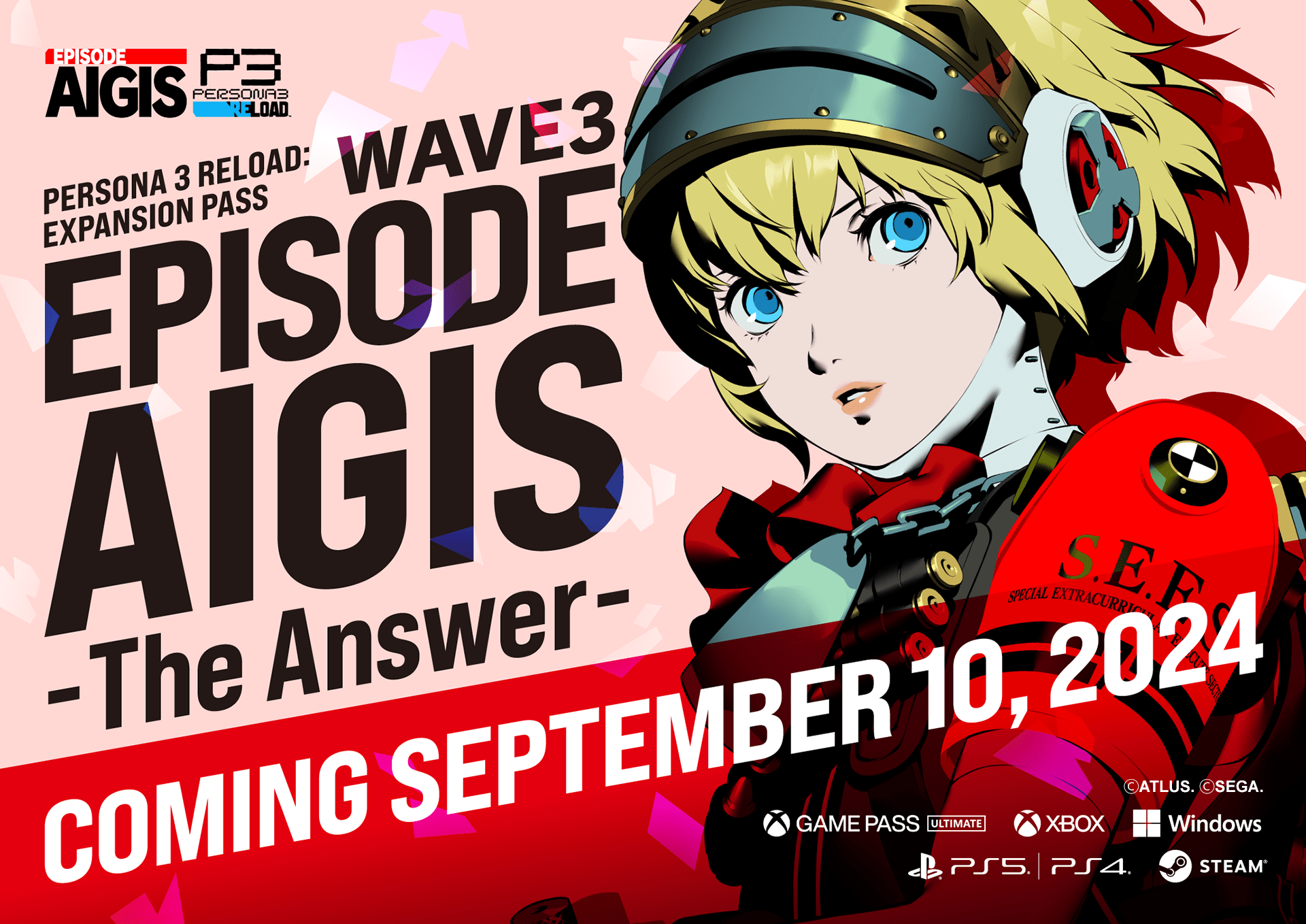 Durante el concierto Persona Live Tour 2024 en Yokohama, ATLUS anunció la fecha de lanzamiento de Persona 3 Reload: Episode Aigis -The Answer-, el contenido final del Pase de Expansión del juego. El conjunto final de contenidos del Pase de Expansión estará disponible el 10 de septiembre de 2024 para Xbox Series X|S, Xbox One, Windows, Xbox Game Pass Ultimate, Steam, PlayStation 5 y PlayStation 4.