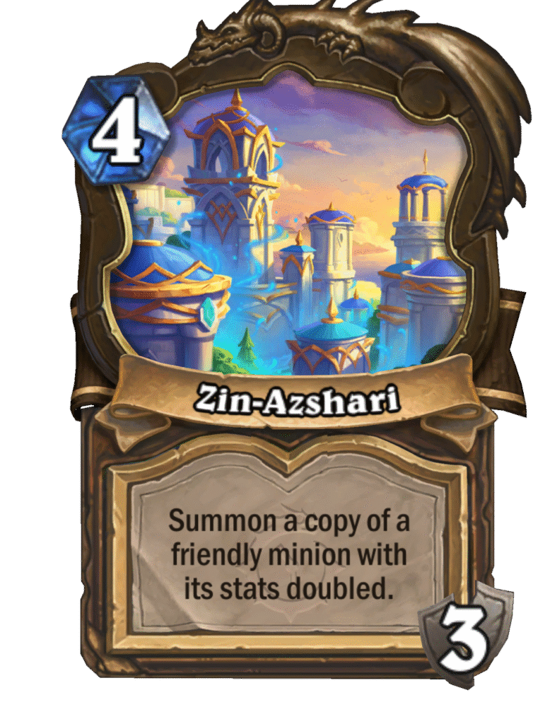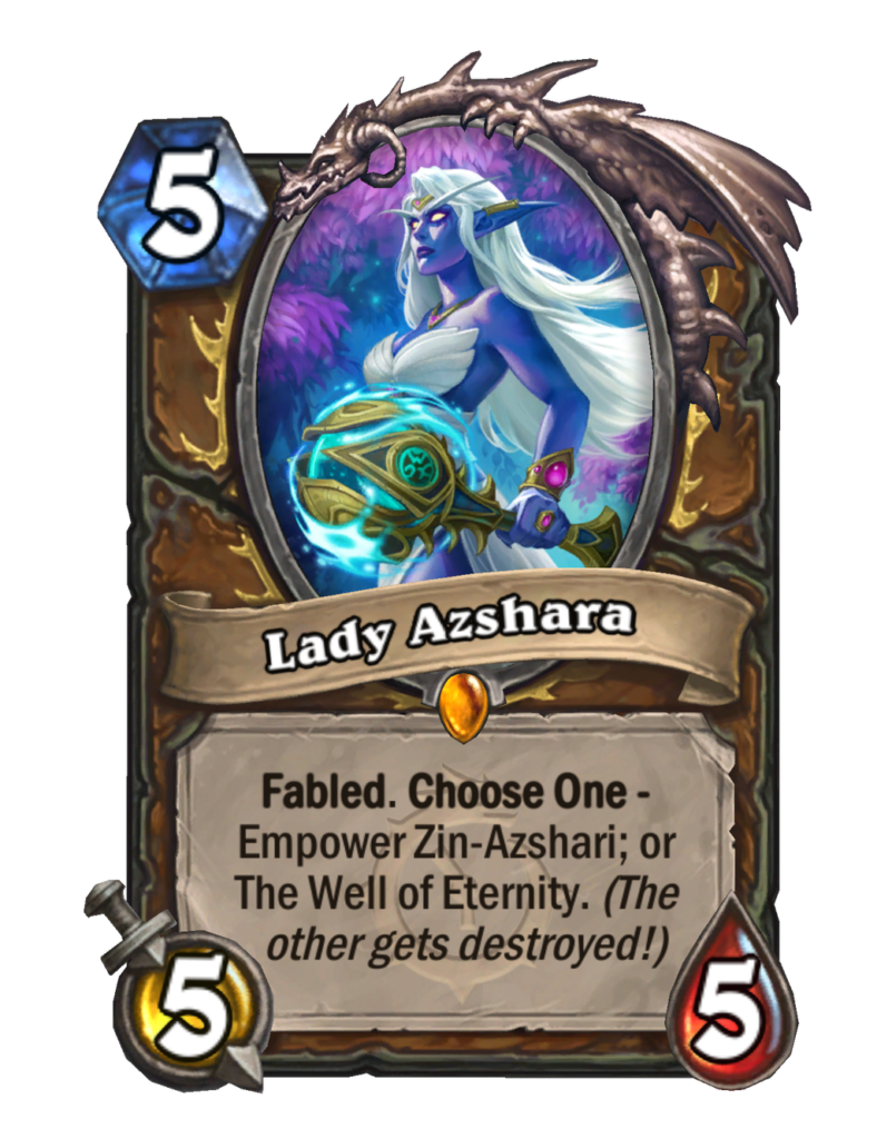 Por ejemplo, Lady Azshara nos otorga dos cartas adicionales dentro de la baraja y, al jugarla en el campo, potencia una de ellas, otorgándole habilidades como copiar esbirros con estadísticas duplicadas o usar hechizos temporales que se lanzan dos veces.