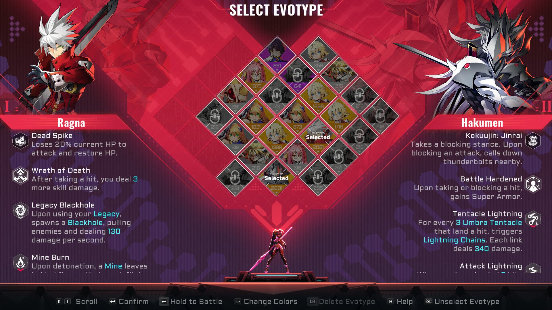 En el juego tendremos un total de 10 personajes jugables, Noel Vermillion de mis favoritas por cierto, y todos ellos del roster original de BlazBlue. Cada personaje tiene sus propias habilidades y estilo de juego muy distinto, igual que en los juegos originales. En este aspecto, si tomamos por ejemplo al protagonista Ragna, su habilidad nos drena el HP, pero lo recuperará mientras daña al enemigo y al hacer esto podremos realizarle más daño a los enemigos.