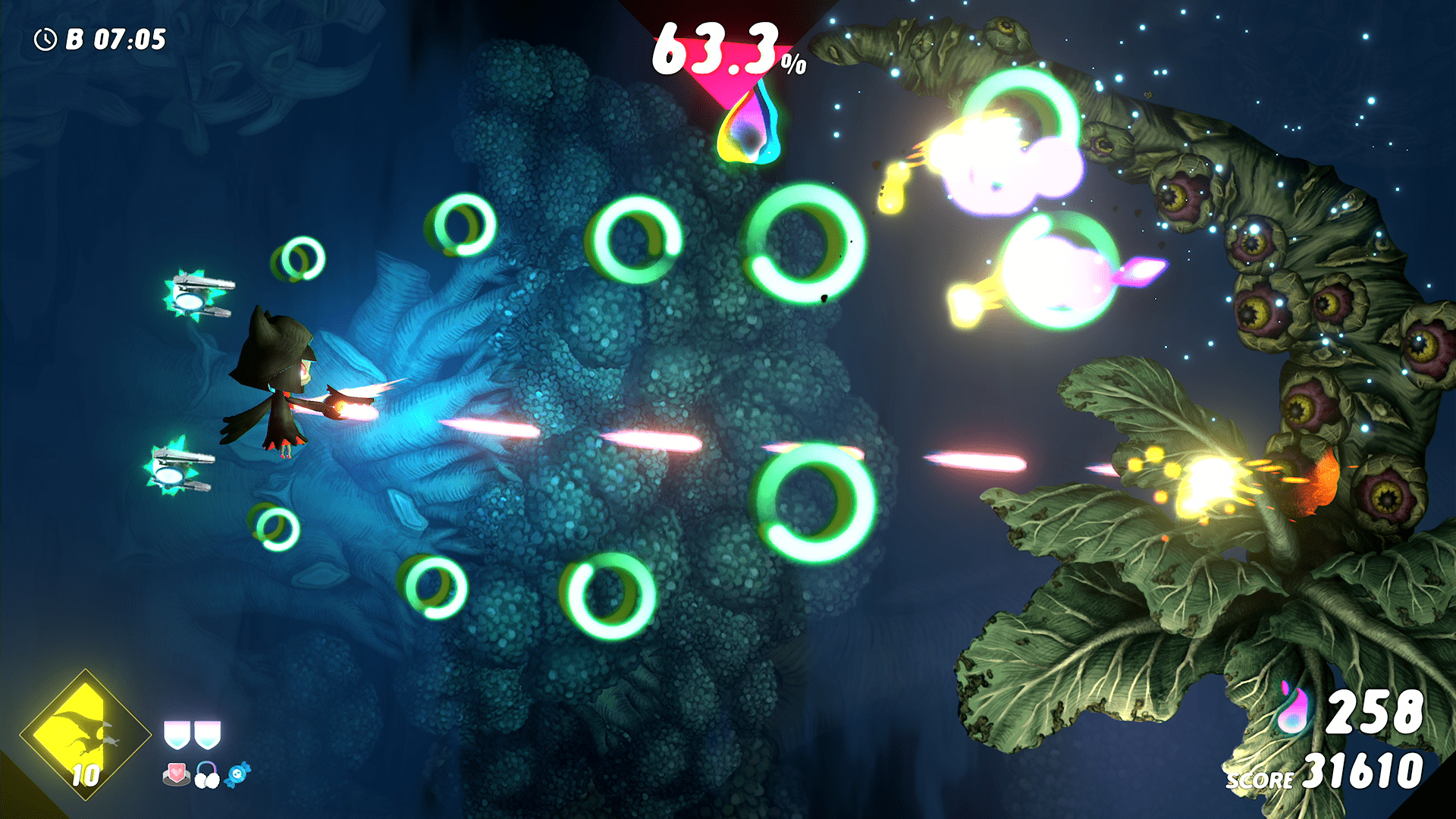 Como te mencionaba, NeverAwake es un shmup con todas sus mecánicas y dificultad, especialmente lo último ya que el juego se vuelve muy desafiante conforme avanzamos los niveles. El objetivo principal será recolectar almas al derrotar enemigos, y el nivel acabará cuando el contador de almas llegue al 100%. Es por eso que nuestro enfoque será recolectar la cantidad necesaria de almas y no morir en el intento. De hecho, en las batallas contra jefes funciona igual, la batalla acaba cuando recolectamos suficientes almas, pero los jefes tendrán etapas y patrones de ataque que no lo harán nada sencillo. De igual forma, podremos decidir durante los jefes si queremos derrotarlos por completo, por lo que se agradece ese aspecto de la jugabilidad.
