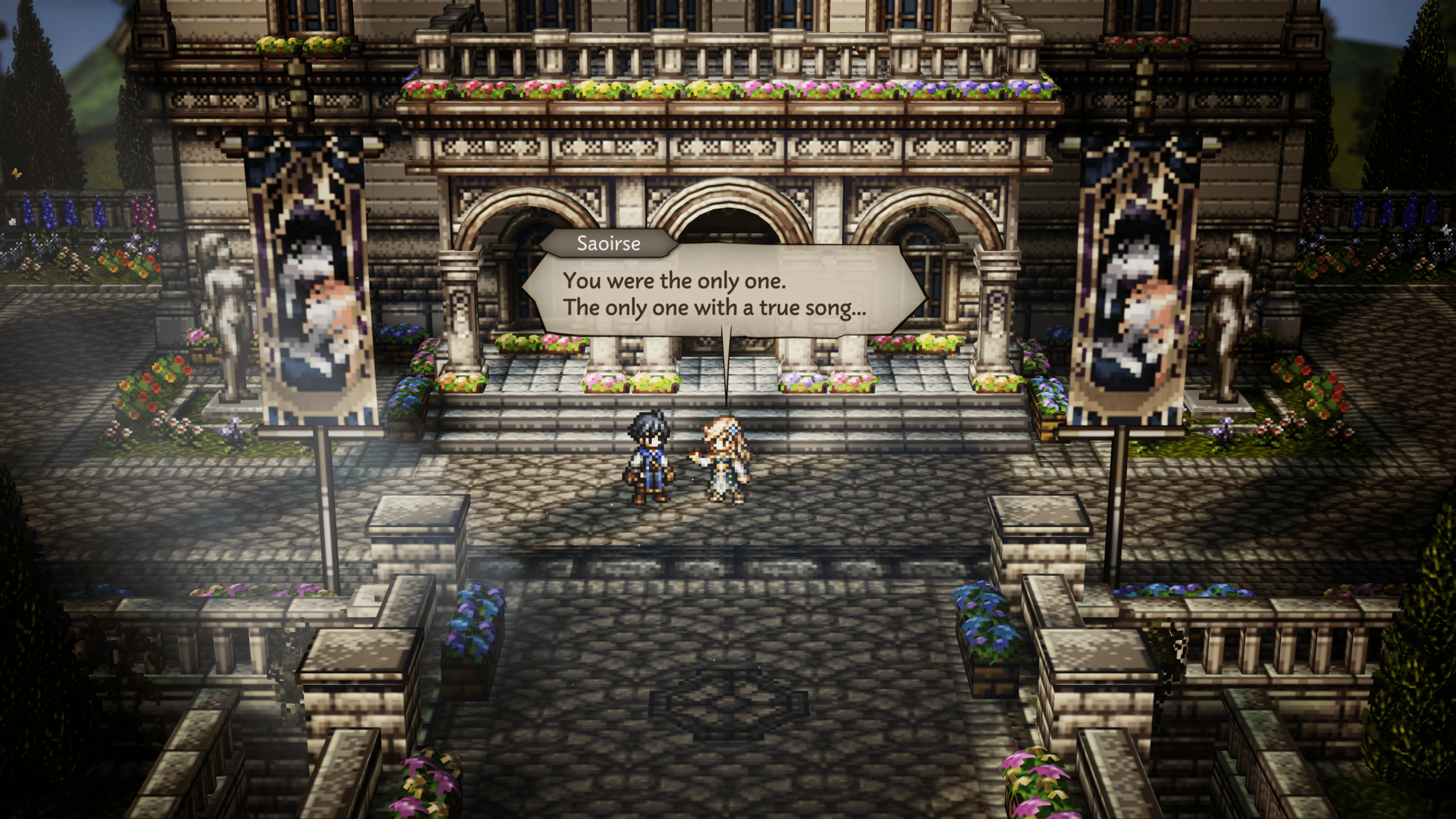 Octopath Traveler 0 mantiene además ese estilo HD-2D que caracteriza a la saga, que incluso se ha aplicado a otros juegos y ha encantado a muchos de nosotros, combinando sprites pixelados con fondos 3D y efectos de iluminación que nos muestran paisajes hermosos y con mucho detalle. Esta estética no es realmente pesada de procesar para las consolas, pero en pantallas 4K llega a resaltar muy bien gracias a sus opciones gráficas, además de contar con animaciones fluidas que llenan de belleza los escenarios y aportan personalidad a cada localidad. Eso sí, comparándolo con la última entrega que sería Octopath Traveler II, donde se percibe un salto técnico bastante grande en iluminación y texturas, el juego no es tan vistozo e incluso ciertos elementos gráficos nos recuerdan más al título original, aunque por el estilo de juego realmente esto no es un problema. Por ejemplo, los personajes siguen presentando diseños atractivos y con muy buenas animaciones, además de actuaciones de voz que le dan aún más peso a las cinemáticas, aunque no todos los contenidos secundarios estén completamente doblados.
