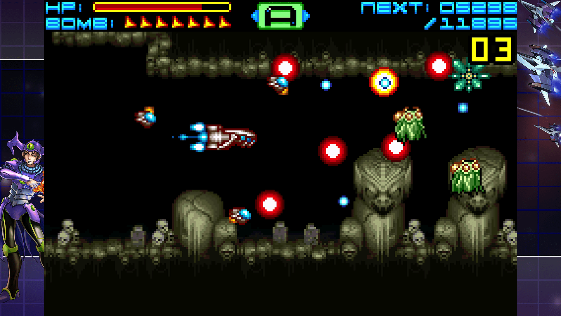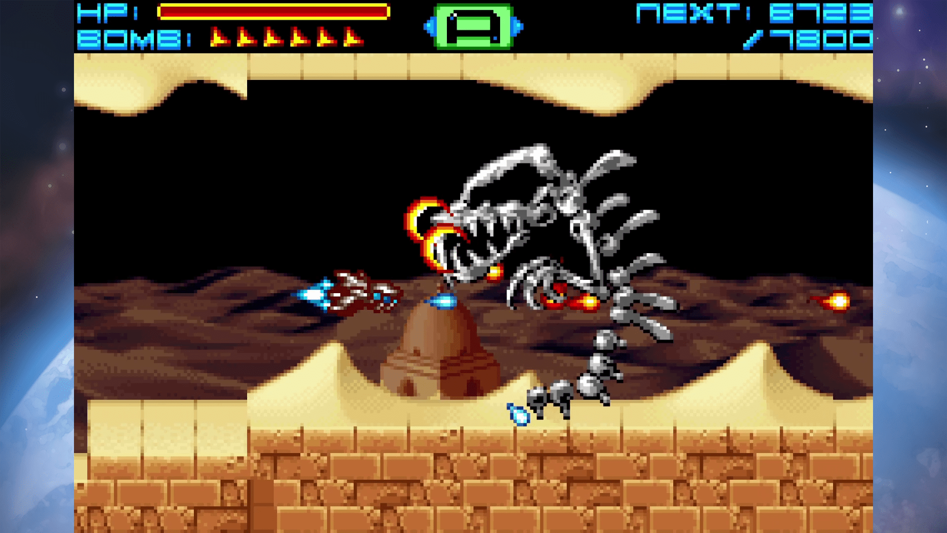 Respecto a su jugabilidad, Sigma Star Saga DX es una mezcla de exploración tipo RPG con combates al estilo shoot ’em up. Mientras exploramos escenarios desde una perspectiva cenital, los encuentros se transforman en batallas espaciales de desplazamiento lateral, volviéndolo una idea muy original incluso para nuestros días. Este cambio constante de ritmo se siente realmente original, aunque algo irregular en su ejecución, ya que balancear ambos estilos de juego no es una tarea sencilla. Aun así, el sistema de personalización de armas, con un montón de combinaciones posibles, añade profundidad y variedad a los combates, recompensando la experimentación del jugador, aunque pueda sentirse un tanto repetitivo tras varias horas.