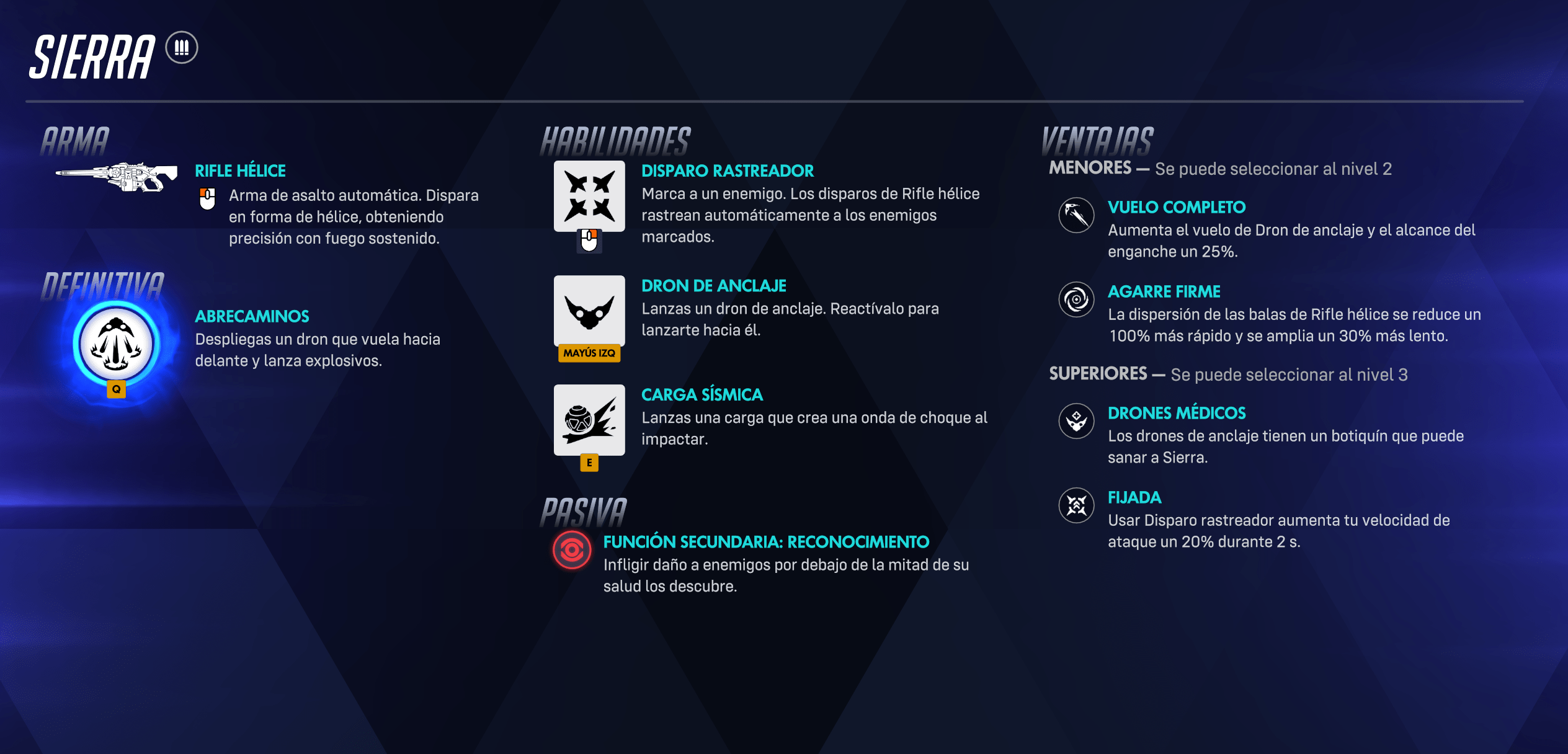 Por supuesto, su kit no acaba ahí, ya que tendremos otras habilidades como el “Dron de Anclaje”, que nos permitirá balancearnos hacia él y obtener altura o recorrer una buena distancia en poco tiempo. Otra de sus habilidades es la “Carga Sísmica”, la cual será bastante molesta, ya que al impacto genera una pequeña onda de choque que siempre viene bien para incomodar a nuestros enemigos. Para finalizar, su habilidad definitiva, llamada “Abrecaminos”, como su nombre indica, desplazará un dron que básicamente disparará en una ancha línea hacia delante a todos los enemigos que tengamos por delante.