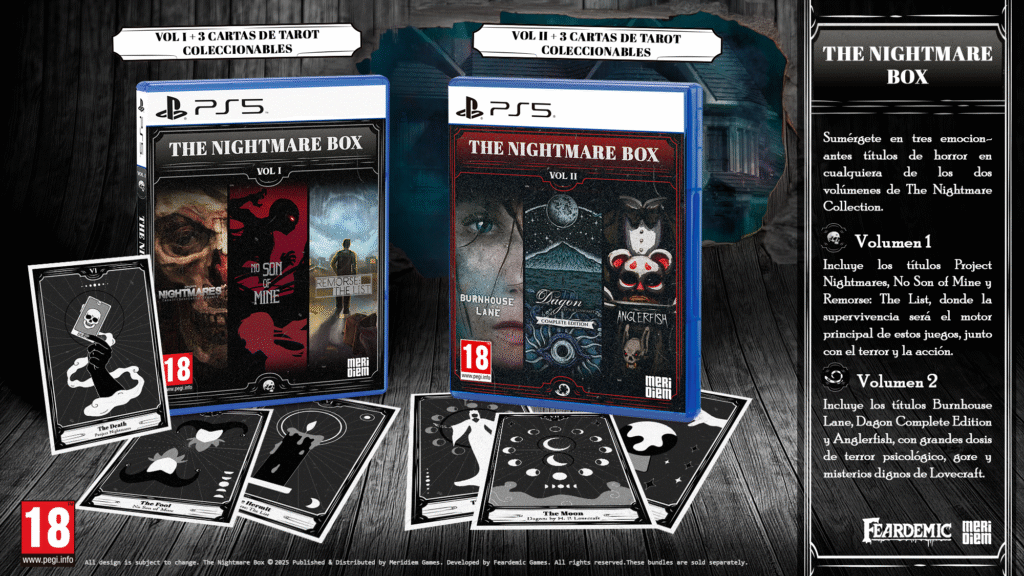 Meridiem se complace en anunciar The Nightmare Box Vol. 1 y Vol. 2 ya están disponibles en formato físico para PlayStation 5The Nightmare Box Vol. 1 incluye Project Nightmares Case 36: Henrietta KedwardNo Son of Mine y Remorse: The List, y The Nightmare Box Vol. 2 incluye Burnhouse LaneDagon: Complete Edition y Anglerfish para PlayStation 5. Publicado digitalmente por Feardemic, los títulos de The Nightmare Box Vol. 1 & Vol. 2 jugarán con tus pensamientos y miedos.