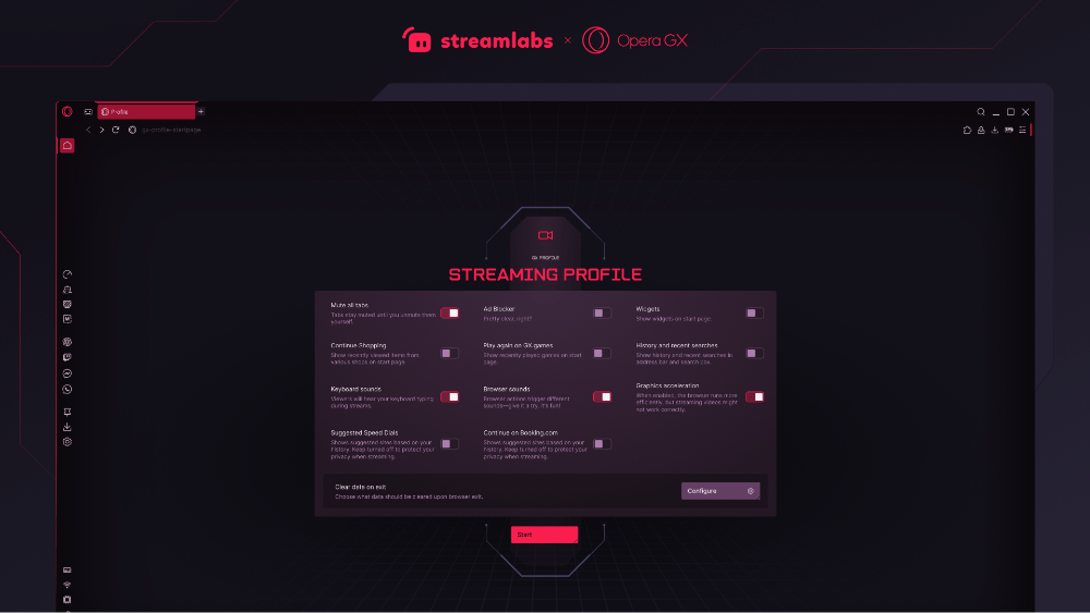 | Una vez creado el Perfil de Streaming, Opera GX genera automáticamente un acceso directo en el escritorio, que permite a los usuarios iniciar directamente su configuración de streaming, sin necesidad de cambiar de perfil o de navegador. Opera GX tiene todo lo que necesitas en un solo lugar. Como parte de este lanzamiento, Opera GX se asoció con Streamlabs, para ofrecer un descuento exclusivo a los usuarios de GX de $12 USD (o su equivalente en moneda nacional) de descuento de una suscripción mensual o $39 USD (o su equivalente en moneda nacional) de un plan anual de Streamlabs Ultra. Para activar el Perfil de Streaming, simplemente haz clic en el logotipo de Opera GX en la esquina superior izquierda del navegador, abre el menú de funciones y selecciona “Perfiles”. Puedes descargar Opera GX a través del sitio web oficial. |