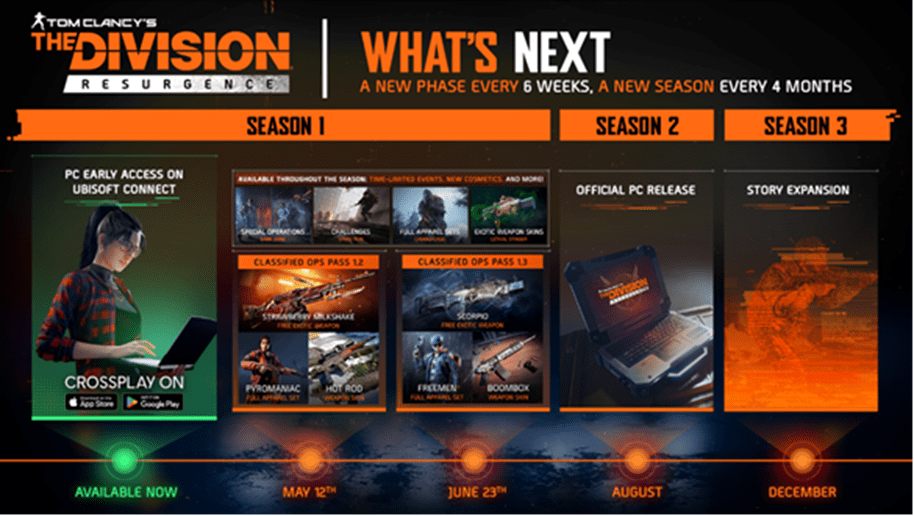 La Temporada 2 marcará el lanzamiento oficial de The Division Resurgence para PC, consolidando la expansión multiplataforma del título, mientras que la Temporada 3 introducirá una gran expansión narrativa al juego.