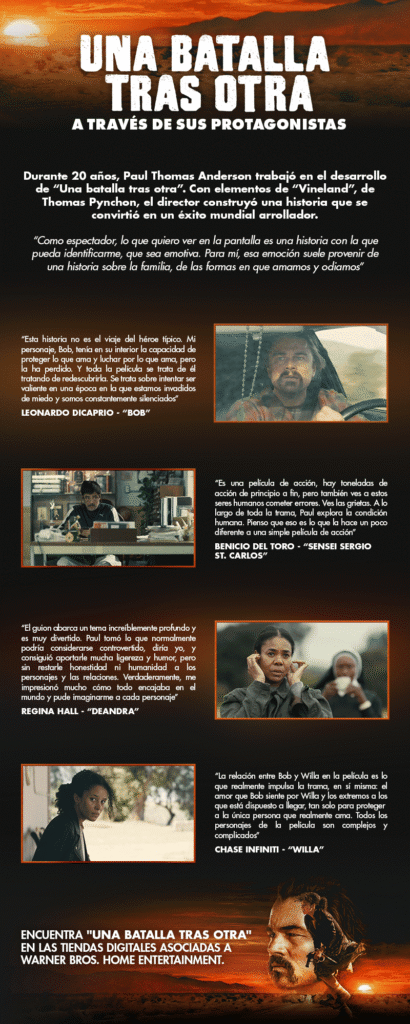 Una batalla tras otra se convirtió en uno de los grandes estrenos del año. Con un caluroso recibimiento por parte de la crítica especializada y números destacados en taquilla, la película dirigida y producida por Paul Thomas Anderson presentó una historia llena de acción de la mano de un reparto destacado. Ahora Warner Bros. Home Entertainment anunció que la producción está disponible en el formato de compra y renta digital y los usuarios ya pueden verla desde sus hogares.